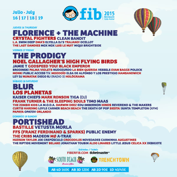 Queremos que dispongas de todas las ventajas que te ofrecemos y que pases un gran FIB 2015, junto a los directos de todos los artistas de un cartel en el que Blur, The Prodigy, Florence + The Machine, en su única fecha en nuestro país, Portishead, Los Planetas, Noel Gallagher’s High Flying Birds, Bastille, Crystal Fighters, Vetusta Morla, Kaiser Chiefs, Mark Ronson, en una de sus tres únicas fechas mundiales, FFS (Franz Ferdinand & Sparks), Jamie T, Frank Turner & The Sleeping Souls, Public Enemy, La M.O.D.A. y muchos más, te esperan con entusiasmo para hacer que lo pases como nunca.