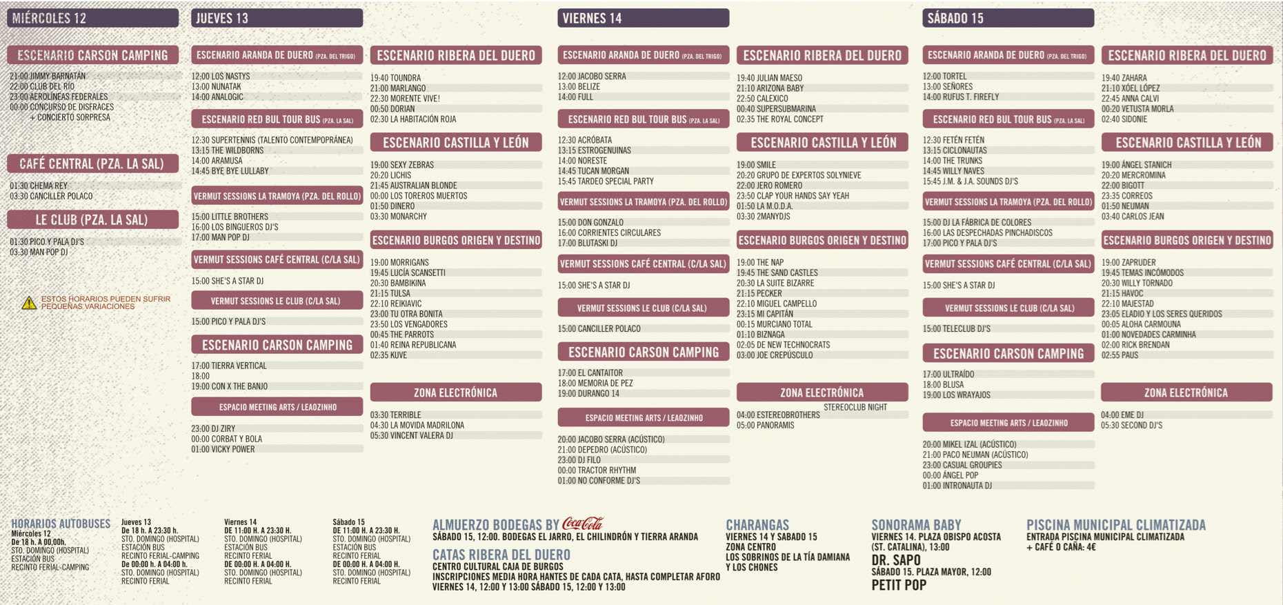 Por su parte, la Plaza del Trigo será testigo de las actuaciones del escenario Aranda de Duero y en el camping se ubicará el Carson Camping. Además, en la Plaza de Rollo y en la Plaza y Calle de La Sal también se sucederán actuaciones (Red Bull Tour Bus y Vermout Sessions La Tramoya, Café Central y Le Club) tanto de bandas como sesiones de DJs desde el mismo miércoles, día de comienzo del festival.