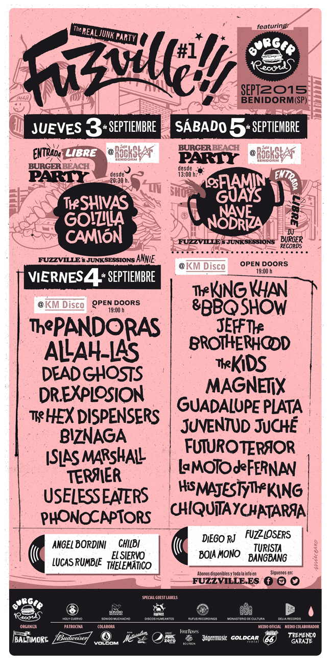 El viernes ´Fuzzville!!! The Real Junk Party , abrirá sus puertas en la Disco KM a las 19:00h con una programación de infarto donde el protagonismo internacional queda en manos de The Pandoras que dará su primer y único concierto en España en 2015 o los californianos Allah-Las además de las altas dosis de adrenalina con bandas como Dead Ghosts, Dr. Explosion, The Hex Dispensers o Biznaga.