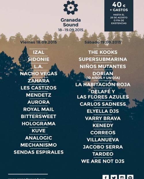 Si ayer os comunicábamos las actuaciones que se celebrarán en el autobús de Red Bull, hoy os damos a conocer la distribución por días del festival Granada Sound. Para el día de apertura los asistentes podrán disfrutar de Izal, Sidonie como platos fuertes y de Les Castizos para un presumible fin de fiesta. Para el segundo día The Kooks, Supersubmarina, Niños Mutantes y como cierre Elyella Djs.