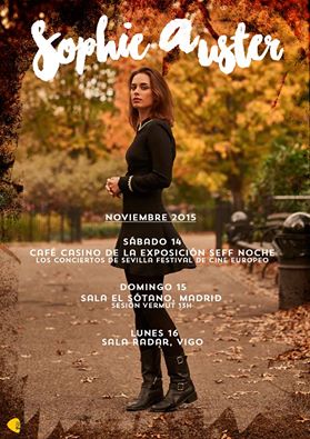 Sophie Auster, la actriz, compositora y cantante norteamericana inicia una mini-gira por España con tres conciertos en diferentes ciudades. Será los días 14,15 y 16 de noviembre en el Café Casino de Sevilla, la sala El Sótano de Madrid y la sala Radar de Vigo respectivamente.