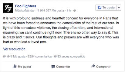 «Con profunda tristeza y gran preocupación por la gente de París, nos vemos obligados a anunciar la cancelación de los conciertos restantes de nuestra actual gira. La violencia sin sentido, el cierre de las fronteras y el duelo mundial hacen que no podamos continuar por ahora. No hay otra manera de expresarlo: esto es una locura, una mierda,. Nuestros pensamientos y nuestras oraciones están con aquellos que han sido dañados o que han perdido a sus personas amadas».