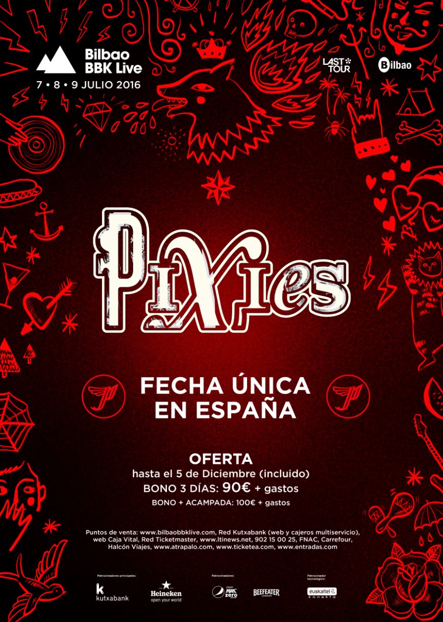 Estos días pasados fueron el Low Festival y el Festival de les Arts , entre otros, los que anunciaba las primeras bandas que actuarían en sus respectivas citas anuales. Y hoy es el BBK Live el que, pisando muy fuerte, anuncian su primer cabeza de cartel. Nada menos que los Pixies , que después de un buen puñado de años parados, y tras atravesar profundas crisis internas con salidas y entradas de componentes, han vuelto a pillar carrerilla y volverán a España para subir a Kobetamendi, en la que será su única actuación en el territorio patrio.