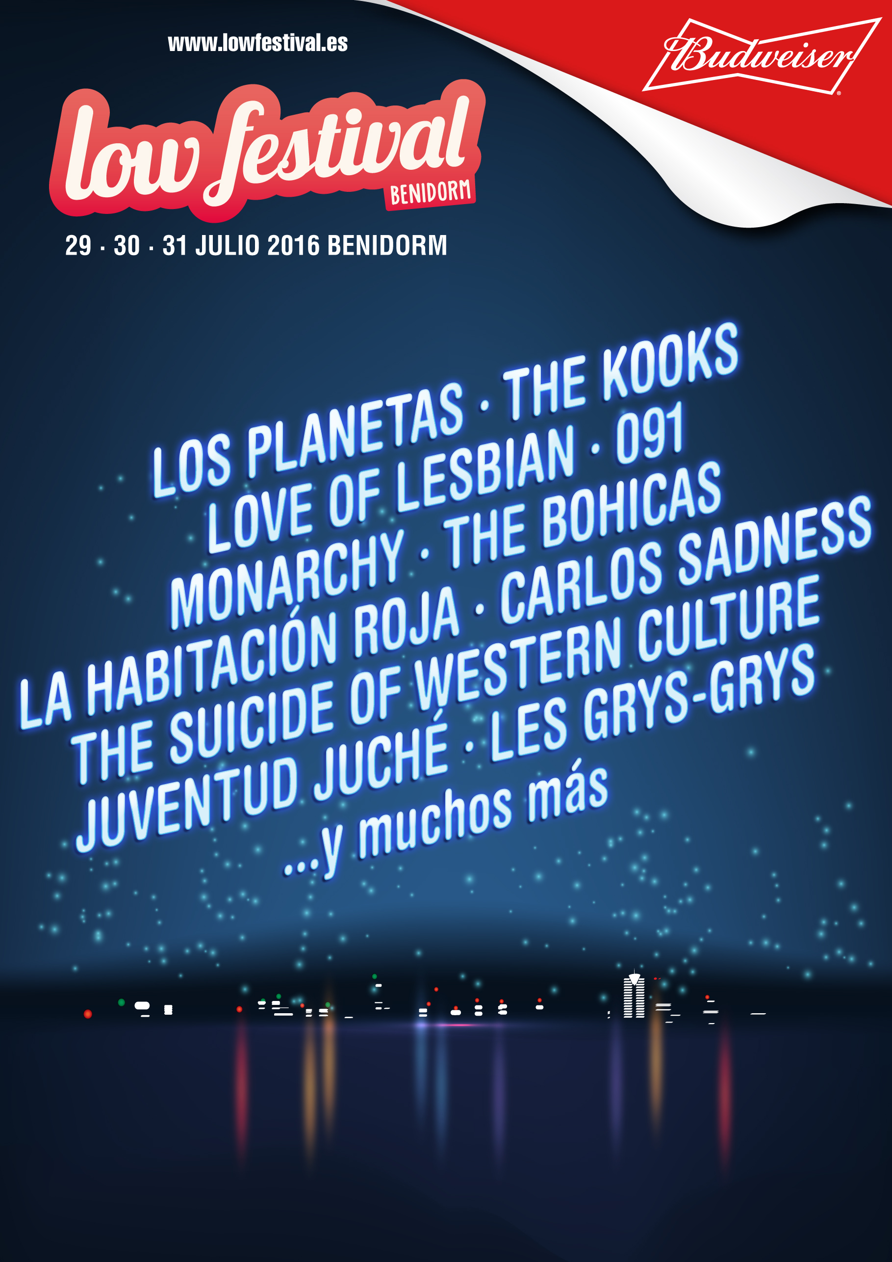 Con la confirmación del directo de Los Planetas, el cartel de Low Festival 2016 suma ya 12 nombres: Los Planetas, The Kooks, Love Of Lesbian, 091, Monarchy, The Bohicas, La Habitación Roja, Novedades Carminha, Carlos Sadness, The Suicide Of Western Culture, Juventud Juché y Les Grys-Grys estarán en Benidorm, como siempre, del 29 al 31 de julio.