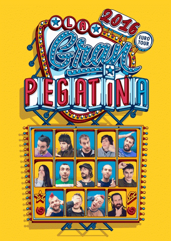 La Pegatina sigue demostrando que no hay nadie mejor que ellos para reinventarse año tras año y sorprender al público con sus espectáculos. Tras trece años de carrera, cinco discos en el mercado y casi mil conciertos visitando 24 países de todo el mundo, el grupo de Montcada i Reixac presenta una gira muy especial para este 2016, La Gran Pegatina – Europear Tour.