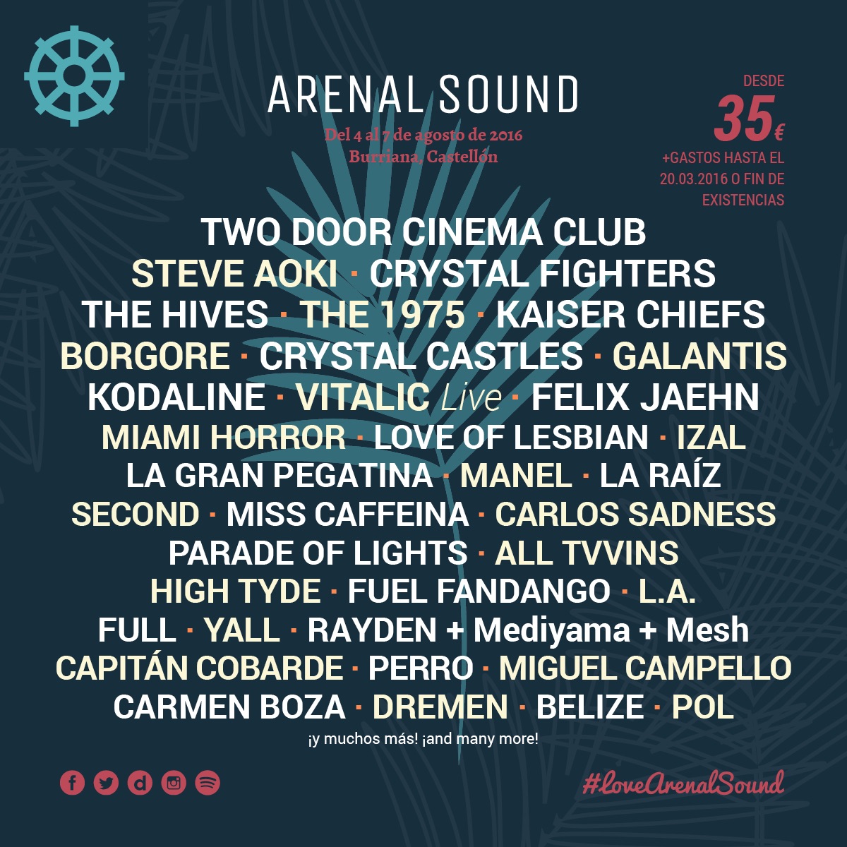 Cabe esperar, por tanto, que podamos escuchar nuevas canciones en Arenal Sound 2016. La incorporación de Kaiser Chiefs se une a los anunciados la pasada semana Felix Jaehn, Manel, Capitan Cobarde y Full y a un cartel encabezado por Two Door Cinema Club, Crystal Fighters, The 1975, The Hives, Kodaline, Steve Aoki, Borgore, Vitalic, Galantis, Crystal Castles, Love of Lesbian, Izal, La Raíz y La Pegatina entre otros.