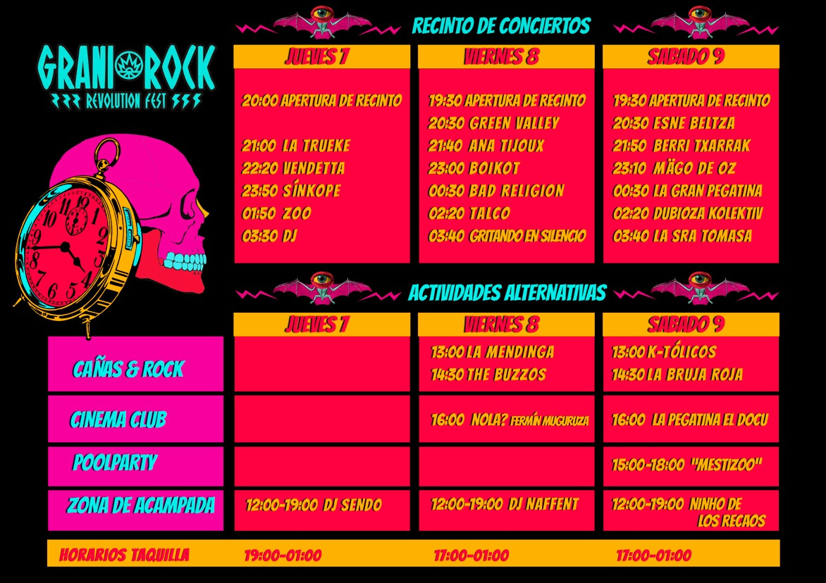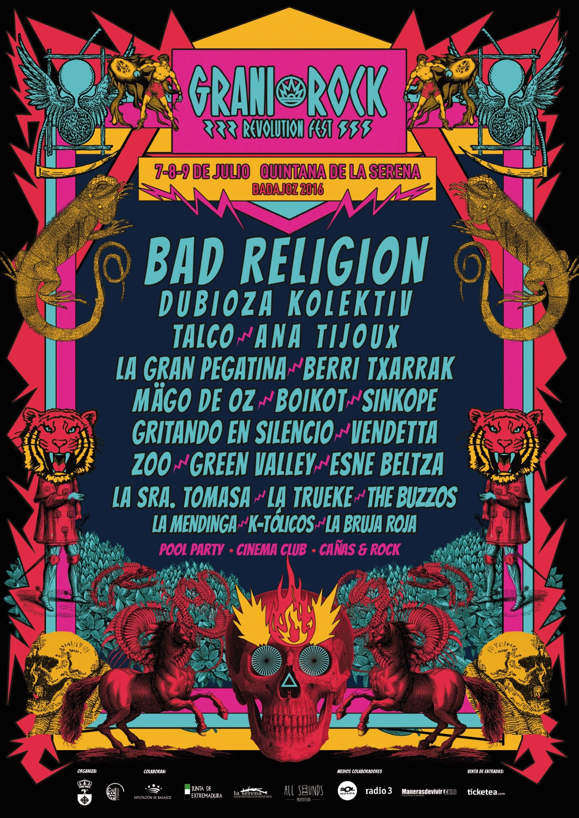 Entramos en la recta final para otra edición del festival Granirock, el cual tendrá lugar los próximos 7, 8 y 9 de Julio en Quintana de la Serena (Badajoz) y contará con bandas como: Bad Religion, Dubioza Kolektiv, Ana Tijoux, Talco, Mago de Oz, La Gran Pegatina, Berri Txarrak, Boikot, Sinkope, Gritando en Silencio, Vendetta, Zoo, Green Valley, Esne Beltza, La Sra. Tomasa, La Trueke, The Buzzos, La Mendinga, K-tólicos o La Bruja Roja.