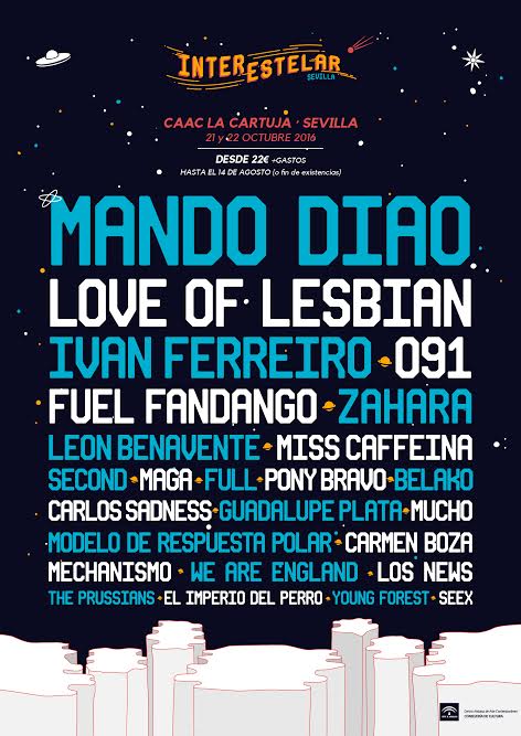Hoy hemos conocido seis nuevos artistas que estarán en el Festival Interestelar Sevilla. Zahara, León Benavente, Full, Mucho, Mechanismo y We are England se unen a los ya confirmados Mando Diao, Love Of Lesbian, 091, Iván Ferreiro, Fuel Fandango, Miss Caffeina, Maga, Second, Carlos Sadness, Pony Bravo, Belako, Guadalupe Plata, Modelo de respuesta polar, Carmen Boza, Los News, The Prussians, El Imperio del Perro, Young Forest y Seex.