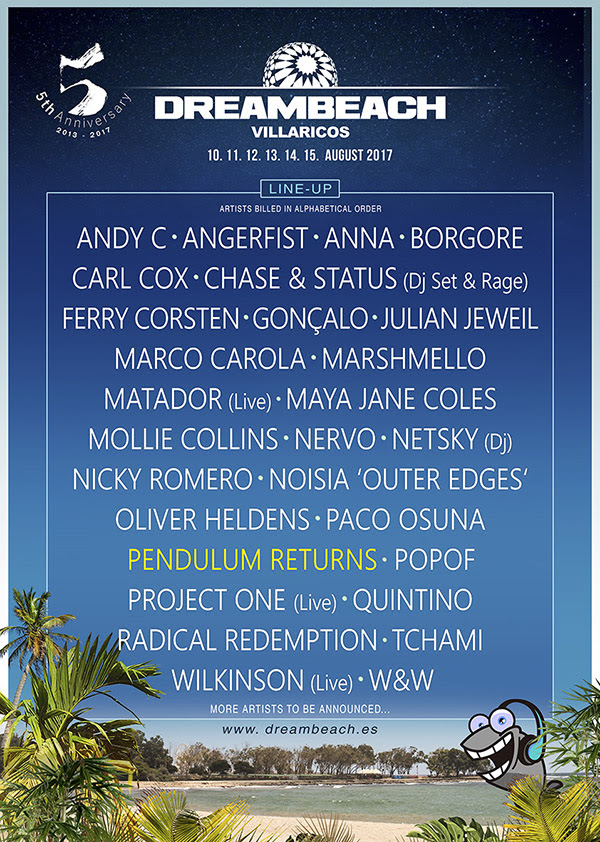 ANDY C – ANGERFIST – ANNA – BORGORE – CARL COX – CHASE & STATUS (Dj Set & Rage) – FERRY CORSTEN – GONÇALO – JULIAN JEWEIL – NERVO – MAYA JANE COLES – MARCO CAROLA – MARSHMELLO – MATADOR (Live) – MOLLIE COLLINS – NETSKY (Dj) – NICKY ROMERO – NOISIA “OUTER EDGES” – OLIVER HELDENS – PACO OSUNA – POPOF – PROJECT ONE (Live) – RADICAL REDEMPTION – TCHAMI – QUINTINO – WILKINSON (Live) – W&W son los artistas internacionales y nacionales que ya han confirmado su presencia en Dreambeach 2017, representando la escena electrónica en todos sus estilos, desde drum&bass a techno, house y future house, dubstep, trance, minimal o dance entre otros.