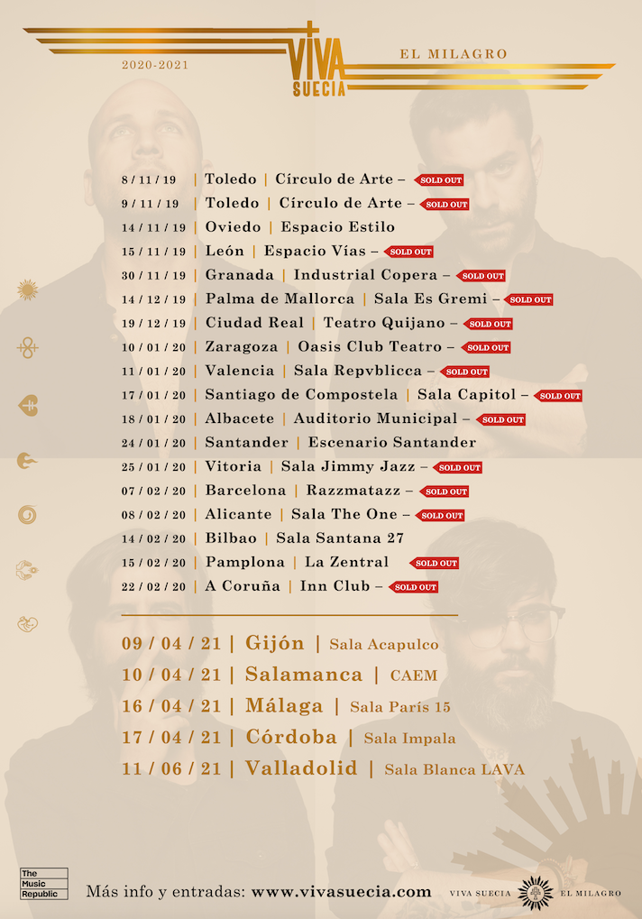 Viva Suecia anuncian nuevas fechas para la celebración de los conciertos de la gira El Milagro que habían sido aplazados debido a la actual situación sanitaria. Se trata de una serie de cinco fechas en Gijón, Salamanca, Málaga, Córdoba y Valladolid que habían sido programadas para este otoño y que finalmente se celebrarán en primavera de 2021.
