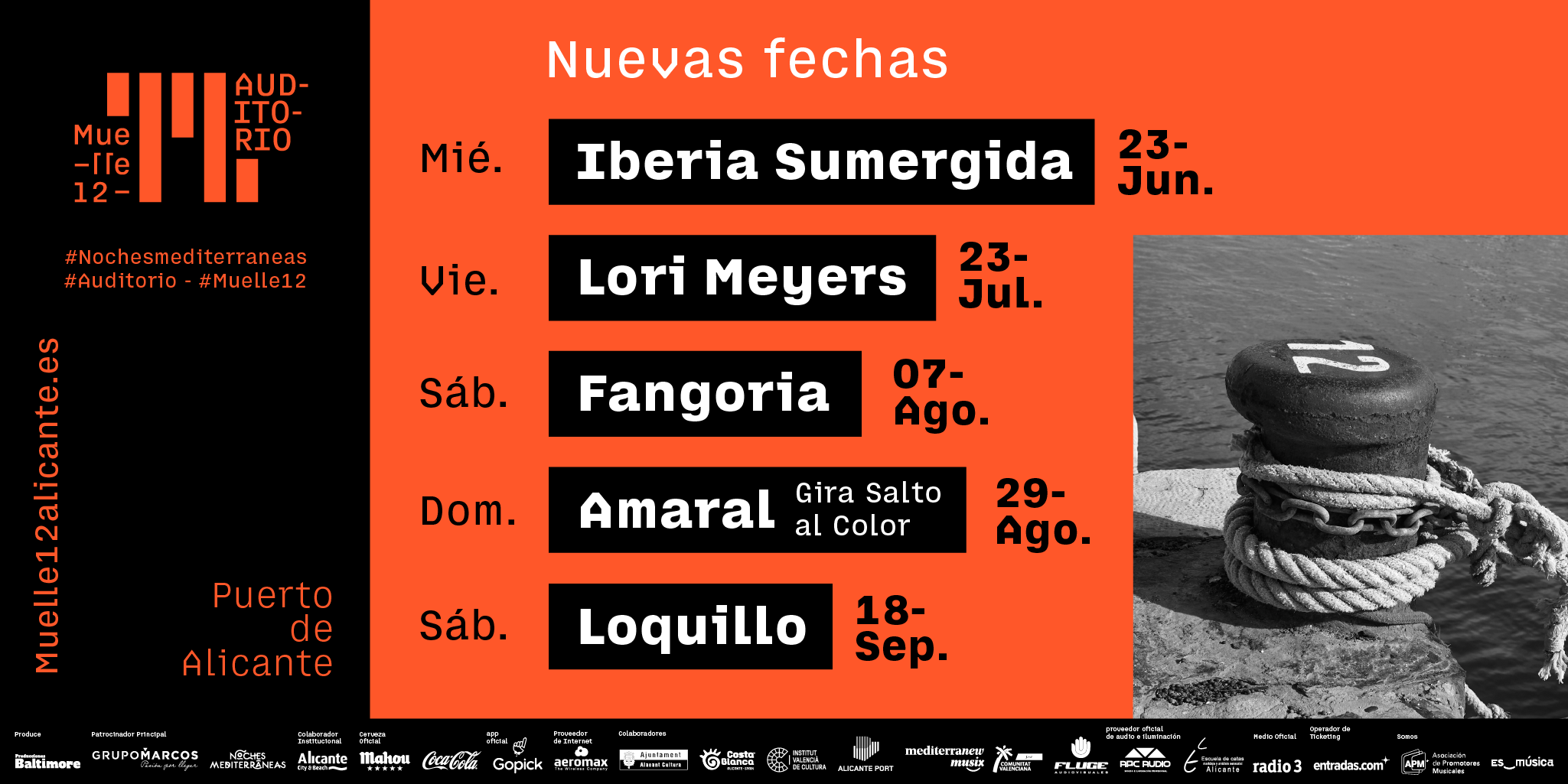 Entradas a la venta hoyLas entradas para los nuevos shows confirmados estarán disponibles hoy a partir de las 16:00h en muelle12alicante.es y entradas.com. El resto de espectáculos de la programación permanecen a la venta.