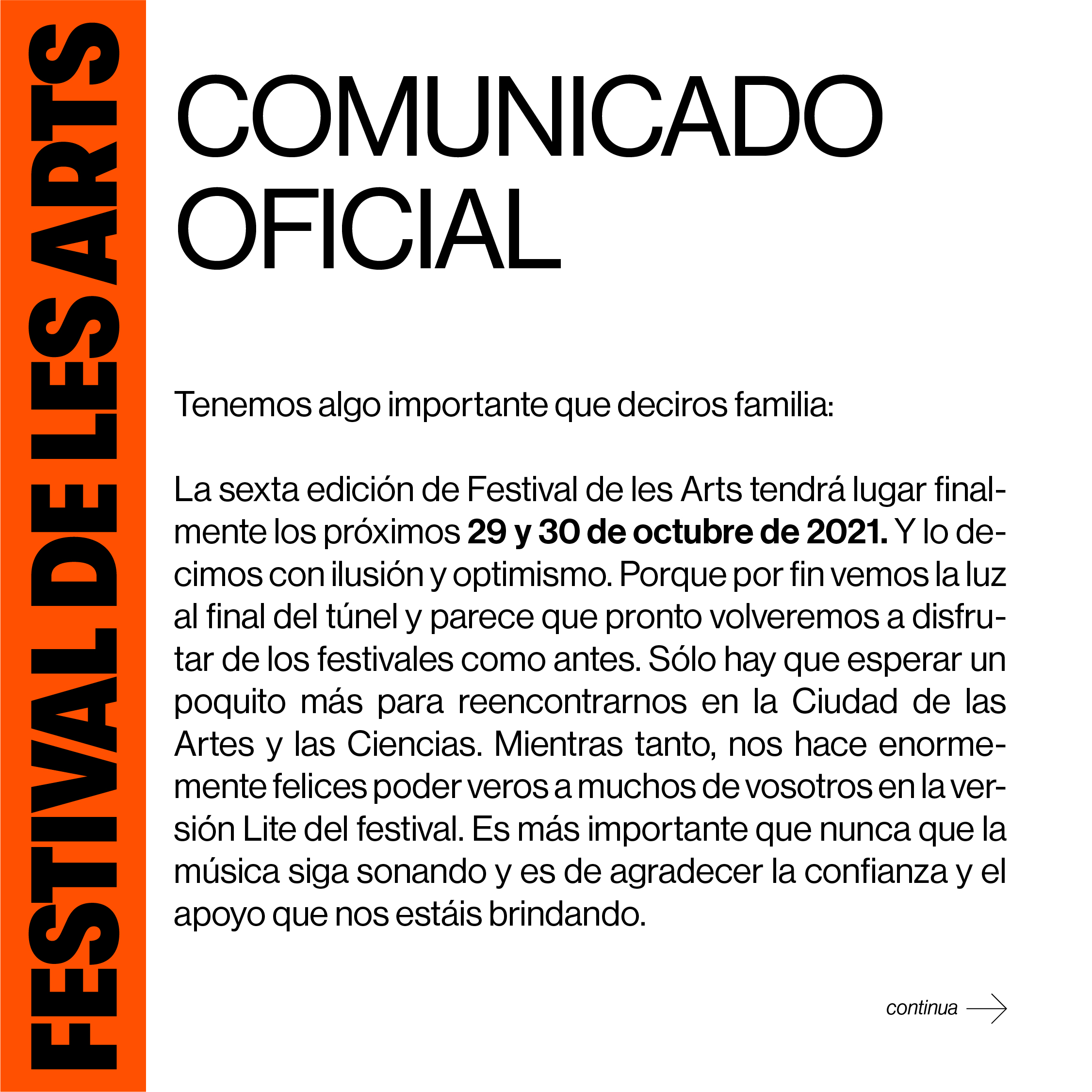 Los abonos, entradas de día o promo bebidas de Festival de les Arts adquiridas para la edición de 2020, son válidos automáticamente para la nueva fecha del 29 y 30 de octubre de 2021. El público sólo tiene que guardarlos y no tiene que realizar ningún trámite.