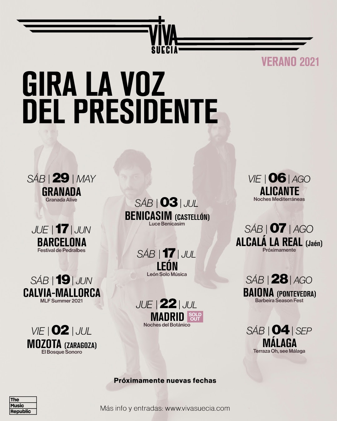 Arranca además justo este próximo viernes 29 de mayo en Granada una gira muy especial para este verano. Una serie de conciertos en los que el grupo volverá a girar con una propuesta escénica completa y en un formato totalmente eléctrico. Con las entradas agotadas solo unas horas después de salir a la venta en Madrid (el 22 de julio en Las Noches del Botánico), ya se han anunciado también fechas en Barcelona (17 de junio, Festival Pedralbes), Mallorca (19 de junio, Mallorca Live Summer), Zaragoza (2 de julio, El Bosque Sonoro), Benicássim (3 de julio, Luce Benicàssim), León (17 de julio, Solo Música), Alicante (6 de agosto, Noches Mediterráneas Muelle 12), Alcalá La Real (7 de agosto), Baiona (28 de agosto, Barbeira Season Fest) y Málaga (4 de septiembre, Terraza Oh, see Málaga). Pronto se anunciarán más ciudades por las que pasará esta gira. Más información y entradas a la venta en la web del grupo www.vivasuecia.com
