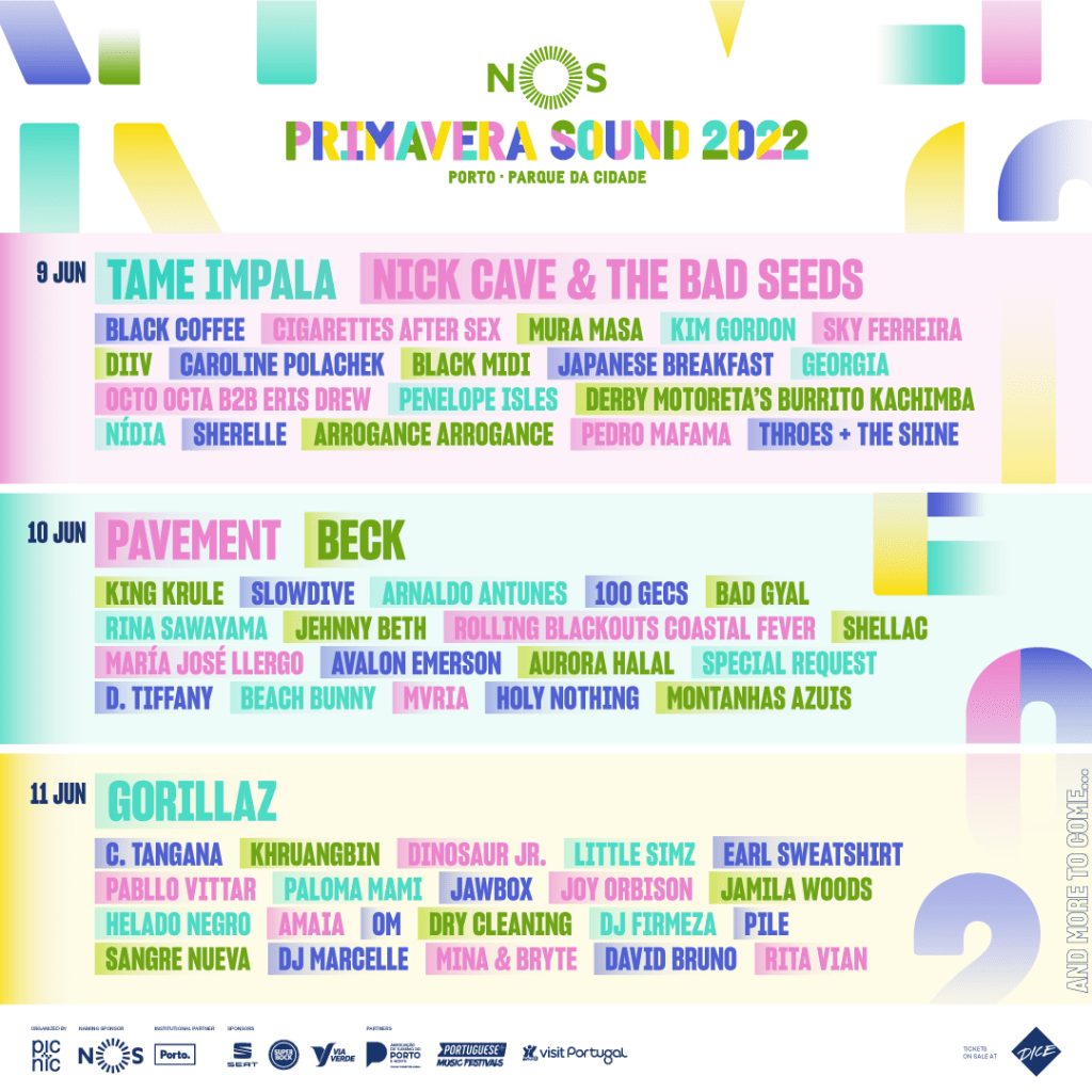 NOS Primavera Sound Porto también mira ya hacia 2022, el año en que recuperaremos el tiempo perdido. Una semana después de desvelarse el cartel de Primavera Sound Barcelona – Sant Adrià 2022, la edición portuguesa del festival anuncia el lineup con el que celebrará su 9º aniversario del 9 al 11 de junio de 2022, encabezado por Tame Impala y su psicodelia multicolor, los Gorillaz de Damon Albarn, Nick Cave and the Bad Seeds en una nueva cita con la eternidad, el icono Beck, los resucitados Pavement, Little Simzcomo nuevo referente del rap británico, la siempre inquieta Kim Gordon y King Krule aullando desde las tinieblas. A falta de algunos nombres que completarán el cartel durante las próximas semanas, son 61 los artistas con sello 100% Primavera Sound que nos acompañarán en el ansiado retorno al Parque da Cidade.