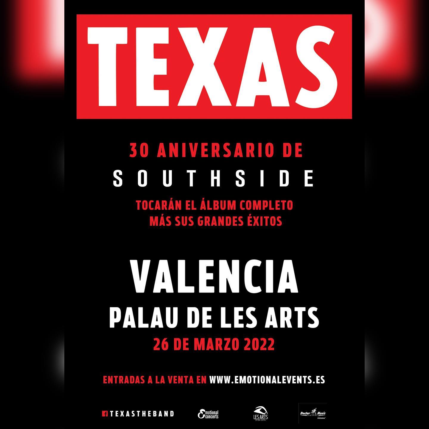 Texas confirma una nueva fecha en España para su gira de marzo de 2022. A los conciertos ya anunciados para el 24 de marzo en Madrid, en la Sala Vistalegre, el día 25 en el Palacio de Congresos de Albacete, el 27 en la sala Razzmatazz de Barcelona, el 29 en el Auditorio Fórum Evolución de Burgos y el 30 de marzo en la sala Santana 27 de Bilbao, se suma ahora un concierto en Valencia, el día 26 de marzo en el Palau de les Arts.