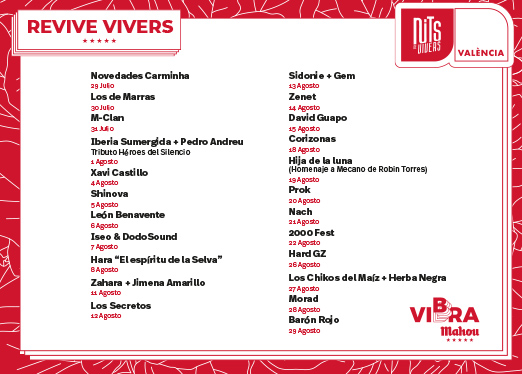 La programación del ciclo y las actividades de Revive Vivers están destinadas a enriquecer la oferta turística de la ciudad con una oferta cultural variada y de calidad. El público asistente tendrá una nueva oportunidad para volver a compartir momentos y disfrutar de la música de manera segura en un espacio al aire libre. Las entradas para para Nits de Vivers se encuentran en www.nitsdevivers.com. Toda la información de las actividades de Revive Vivers en www.mahou.es/vibra/revivevivers.