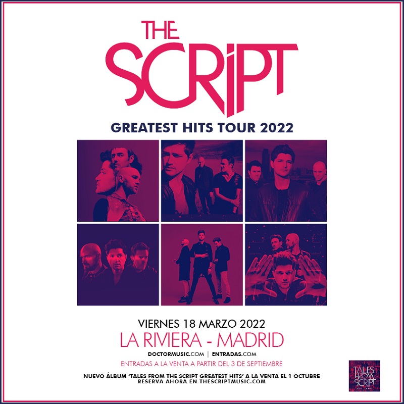The Script regresa con un nuevo álbum a la vista, Tales From The Script, dedicado a todos los temas de la banda que han ocupado un lugar importante en la escena del pop internacional. Y nada mejor que acompañar ese lanzamiento de una gira donde compartirán con nosotros todos esos éxitos en directo, ‘Greatest Hits Tour 2022’. En España tendremos una única oportunidad para verlos en concierto, será el 18 de marzo de 2022 en La Riviera, en Madrid.