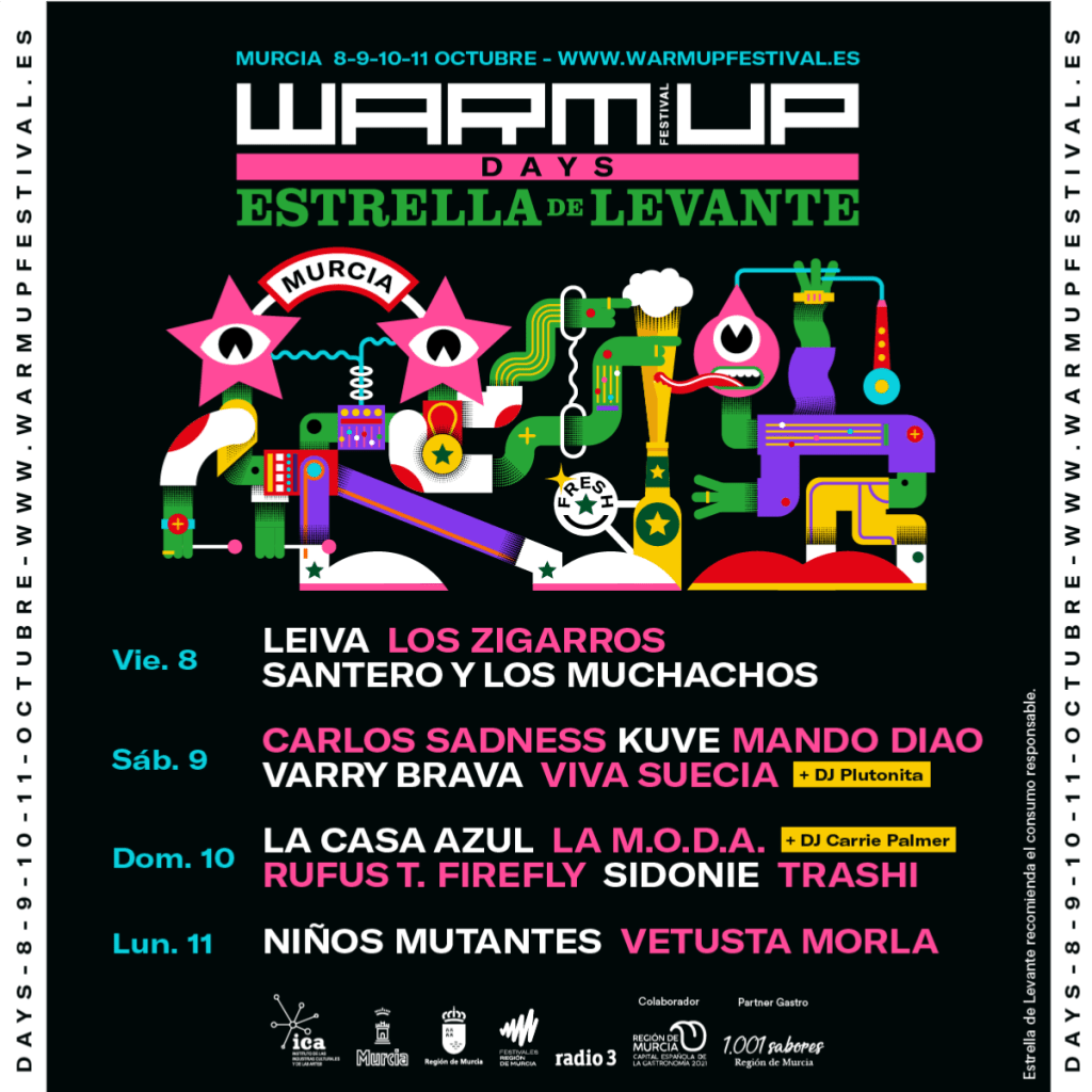 Con el apoyo del ICA (Instituto de las Industrias Culturales y de las Artes de la Región de Murcia), Estrella de Levante como patrocinador oficial, el Ayuntamiento de Murcia y el Colegio Oficial de Farmacéuticos de la Región de Murcia (COFRM), WARM UP Days afronta ya su recta final con casi el 50% de las entradas de día vendidas y los últimos 200 abonos de sábado y domingo a la venta.