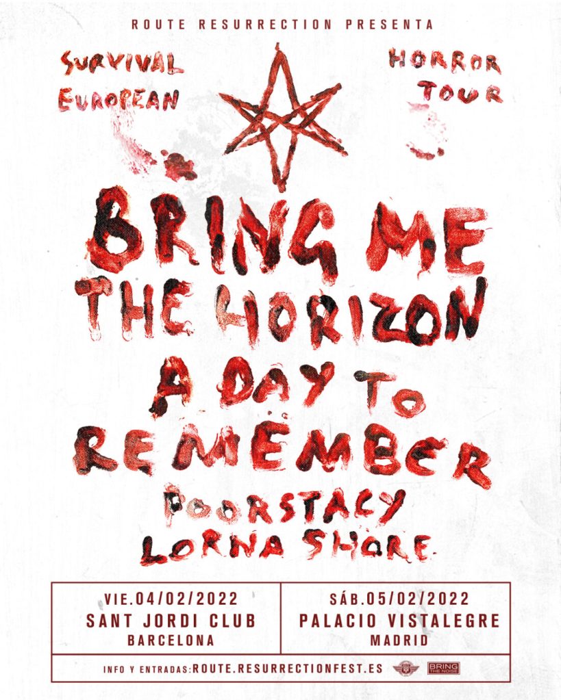 Bring Me The Horizon actuarán en febrero del 2022 en Madrid y Barcelona, en pabellones de gran tamaño, y traerán toda su producción para hacer los mayores conciertos que jamás han hecho en el país y con un setlist de infarto. Además, vendrán con un invitado especial que tenemos muchas ganas de ver desde hace años: A Day to Remember, una de las bandas de la escena pioneras y más reconocidas a nivel global. A este pack se le unen también Poorstacy, el rapero de Florida que está causando sensación mezclando rock y hip hop, y los siempre brutales Lorna Shore con su deathcore progresivo, haciendo que esta gira sea todo un planazo para los amantes del metal actual. Cae en fin de semana, así que no hay excusa para no venir. Las fechas son las siguientes; viernes 4 de febrero, Barcelona, Sant Jordi Club y sábado 5 de febrero, Madrid, Palacio Vistalegre.