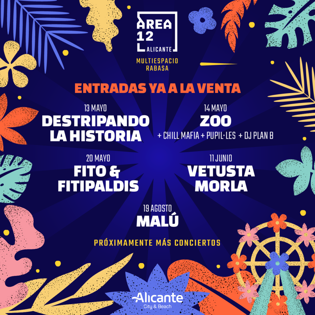 En orden cronológico: Destripando la historia (13 de mayo), Zoo + Chill Mafia + Pupil·les + Dj Plan B (14 de mayo), Fito & Fitipaldis (20 de mayo), Vetusta Morla(11 de junio), Malú (19 de agosto). Todas las entradas están ya a la venta en www.area12alicante.es y en www.entradas.com