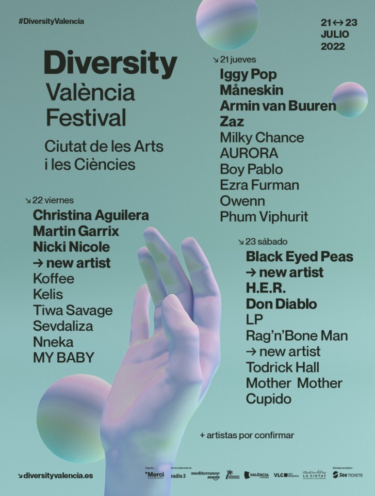 El cartel del recién nacido Diversity València Festival cuya primera edición tendrá lugar del 21 al 23 de julio de 2022 en la monumental Ciutat de les Arts i les Ciències, suma nuevas presencias internacionales tras la confirmación de figuras como Måneskin, Iggy Pop, Christina Aguilera y Black Eyed Peas.