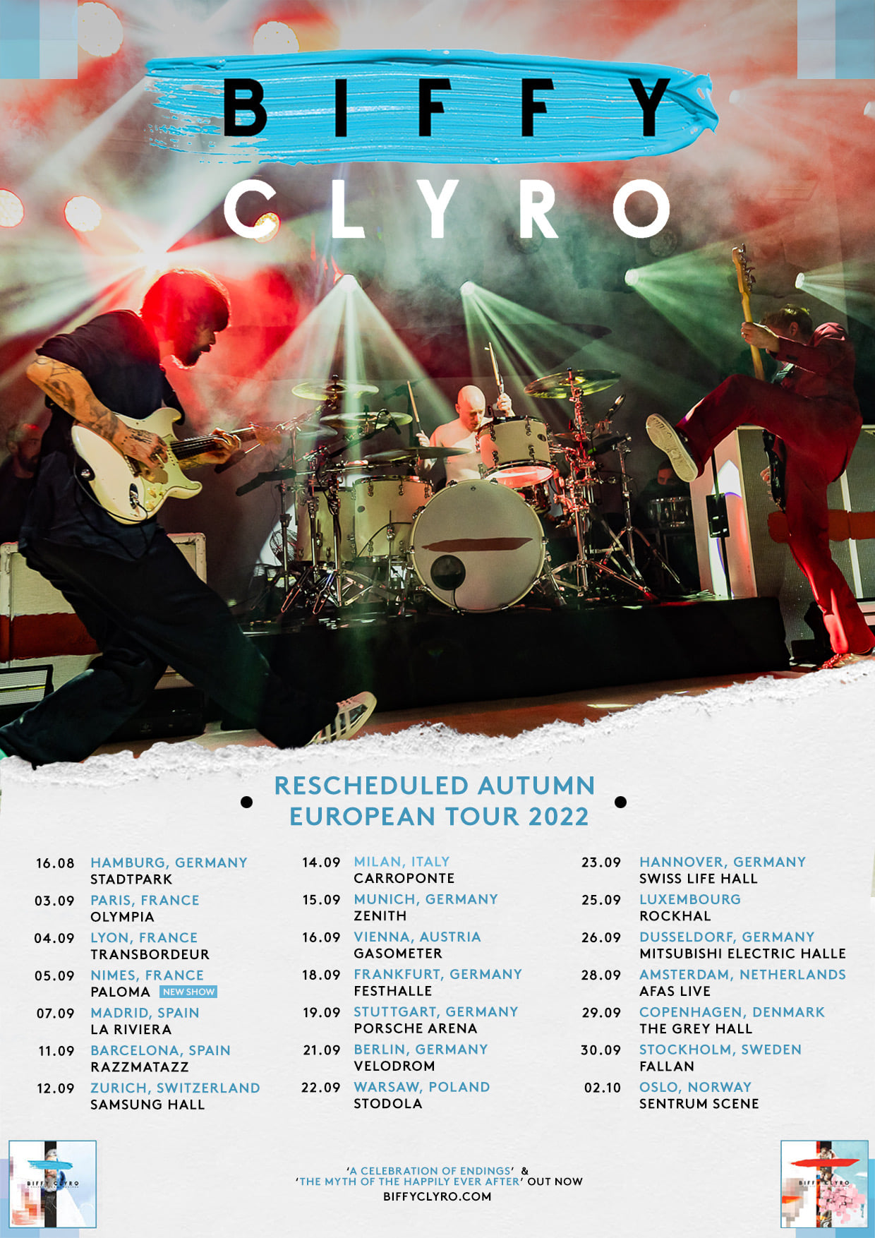 Lamentablemente y tal y como nos imaginábamos, debido a la situación actual y a las restricciones derivadas de la pandemia, la gira europea de presentación de «The Myth of the Happily Ever After», último disco de los escoceses Biffy Clyro que se iba a celebrar durante el invierno y primavera de este 2022, incluidos los conciertos del 10 de marzo en la Razzmatazz de Barcelona y del 11 de marzo en La Riviera de Madrid quedan reprogramada para el otoño de este mismo año.