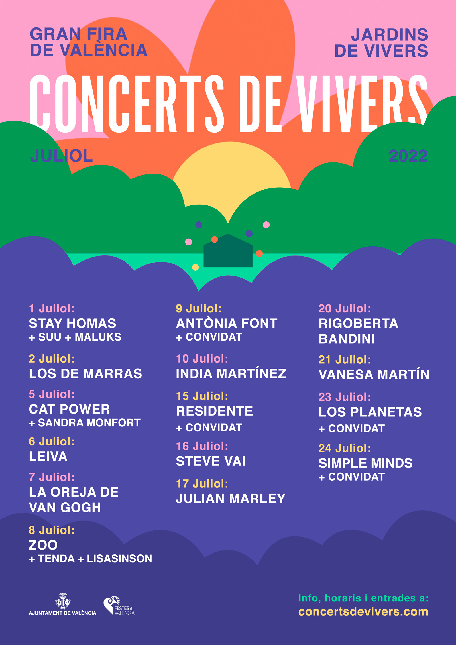 Tras su recordada actuación en 2018, Residente volverá a los Jardines de Viveros el jueves 15 de julio. Ese día, en el recinto resonarán melodías de hip hop, reggaetón y ritmos latinos y se escucharán temas de los discos editados por el puertorriqueño y también por Calle 13. Al día siguiente, el rockero Steve Vai interpretará las composiciones de su nuevo disco, Inviolate. Tras más de 30 años en la carretera, el estadounidense ha sido reconocido como uno de los grandes virtuosos de la guitarra eléctrica, instrumento con el que explora el espectro de las emociones humanas. El reggae también tendrá lugar en los Conciertos de Viveros con la fiesta de presentación del festival Rototom Sunsplash de Benicàssim que protagonizará Julian Marley el día 17.