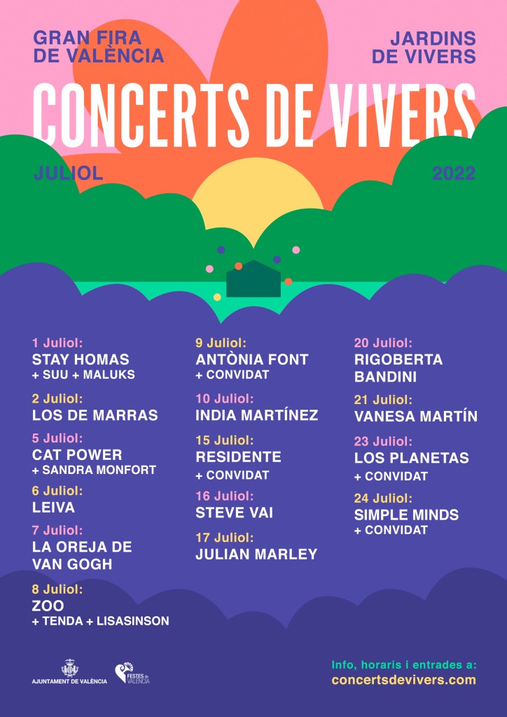 El Ayuntamiento de València ha presentado esta mañana la programación de la próxima edición de los Conciertos de Viveros. Las actuaciones tendrán lugar entre el viernes 1 y el domingo 24 de julio y se enmarcan en la tradicional Gran Feria de València. Por el momento, el ciclo está formado por 15 fechas y más de 20 artistas internacionales, estatales y valencianos. Se debe tener en cuenta que el evento se realizará con la participación de 10 empresas promotoras valencianas. La imagen del festival es obra del diseñador y músico Enric Alepuz.