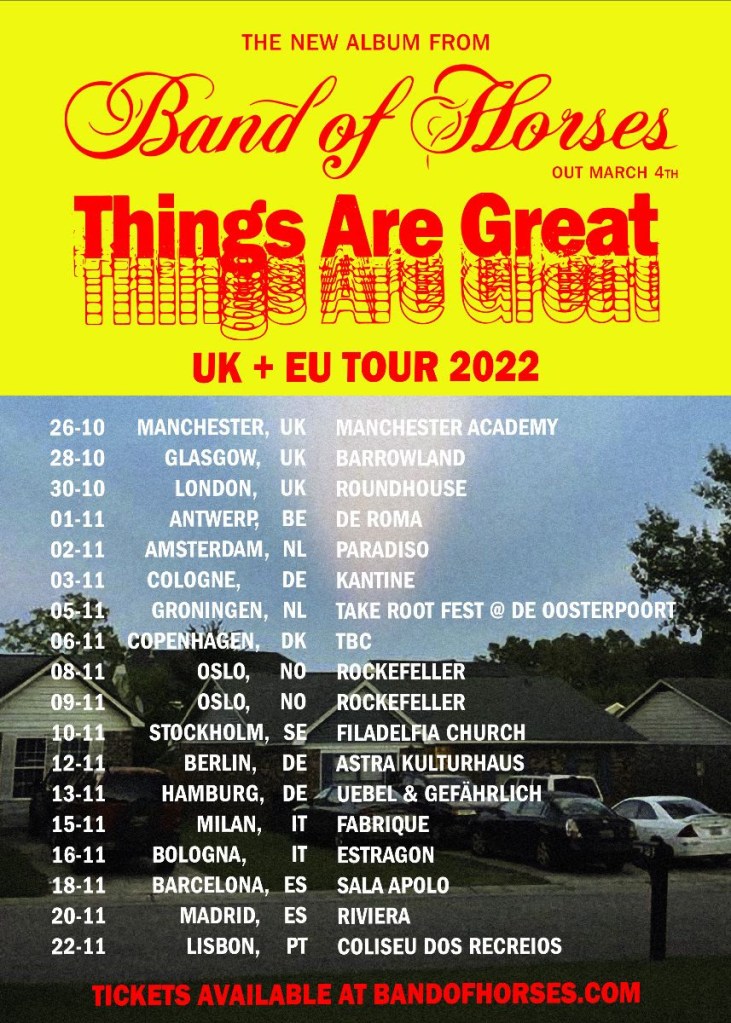 ‘Things Are Great’ saldrá a la venta el 4 de marzo de 2022 a través de BMG y se perfila como uno de sus mejores lanzamientos hasta la fecha. Con canciones como «Lights», «In Need of Repair» y «Crutch» (esta última alcanzó el número 1 en la lista de éxitos de la radio AAA, marcando el primer topper de la banda), su sexto álbum de estudio y primer disco en más de cinco años muestra a una banda en su mejor momento. Sonoramente, el álbum es un retorno a su trabajo anterior y al tipo de ética cruda que se encuentra en el corazón de Band of Horses.