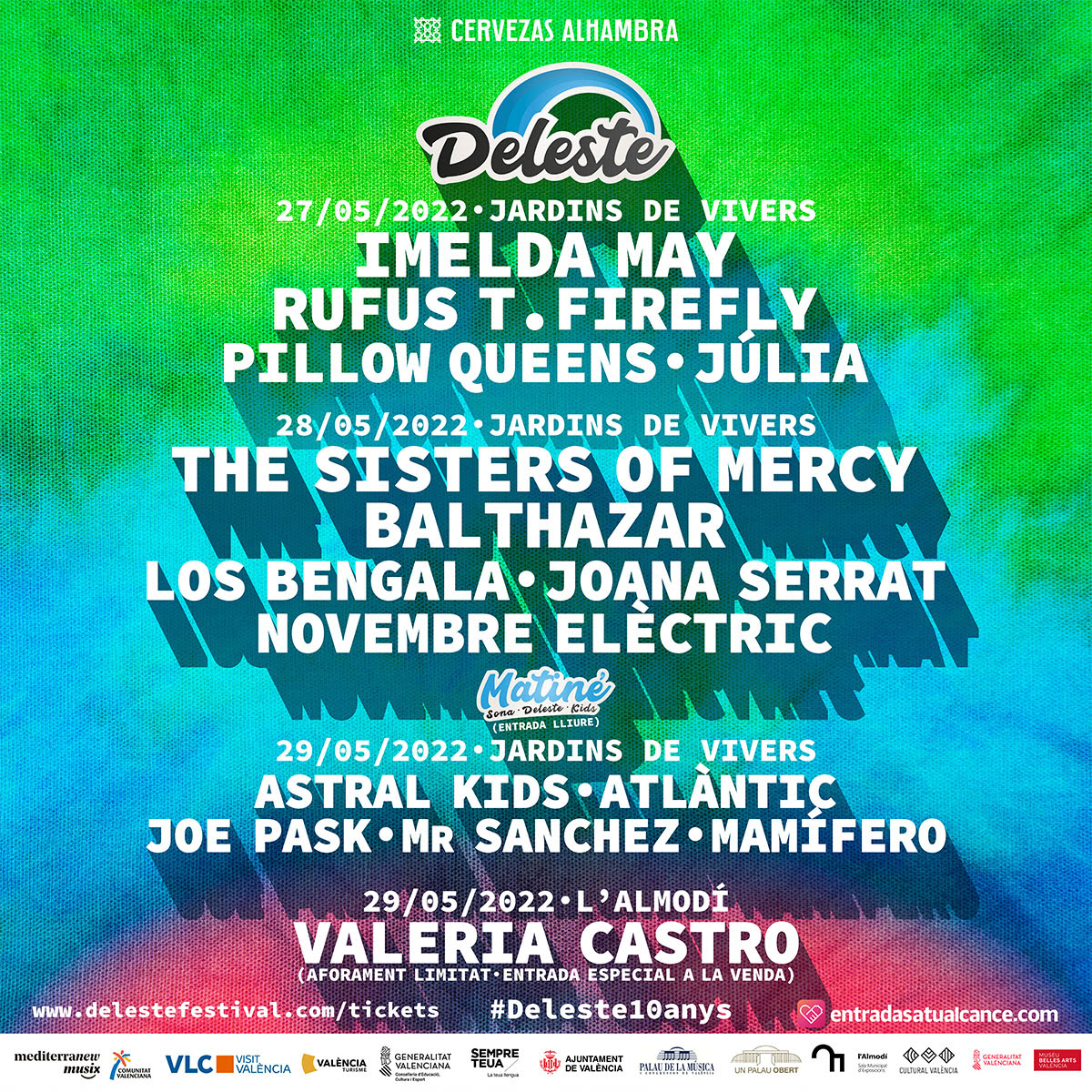 El festival Deleste ha dado a conocer la programación completa de una de sus ediciones más especiales: la de su décimo aniversario. Desde el viernes 27 y hasta el domingo 29 de mayo, los Jardines de Viveros de la ciudad de València acogerán a 14 bandas internacionales, estatales y valencianas con propuestas de pop-rock que incluyen valores emergentes y artistas consolidados. Por otro lado, con la voluntad de llevar la música a otros puntos de la localidad, la cantante Valeria Castro dará un recital en un formato íntimo en El Almudín.