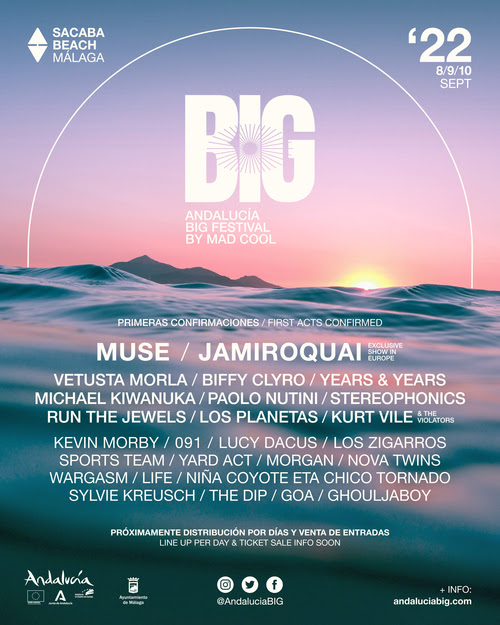 Andalucia Big Festival tendrá lugar en la playa de Sacaba los días 8, 9 y 10 de septiembre de este año. Contará con más de cincuenta artistas nacionales e internacionales, entre los que se encuentran los primeros nombres confirmados que incluyen a Muse, Jamiroquai, en su único concierto en Europa, Vetusta Morla, Nova Twins, Sylvie Kreusch y Morgan. Contará con tres escenarios con una variada y ecléctica programación musical para todos los públicos: pop, indie, rock, electrónica y nuevas tendencias con artistas de primer nivel, así como talento emergente que harán del evento una experiencia única.