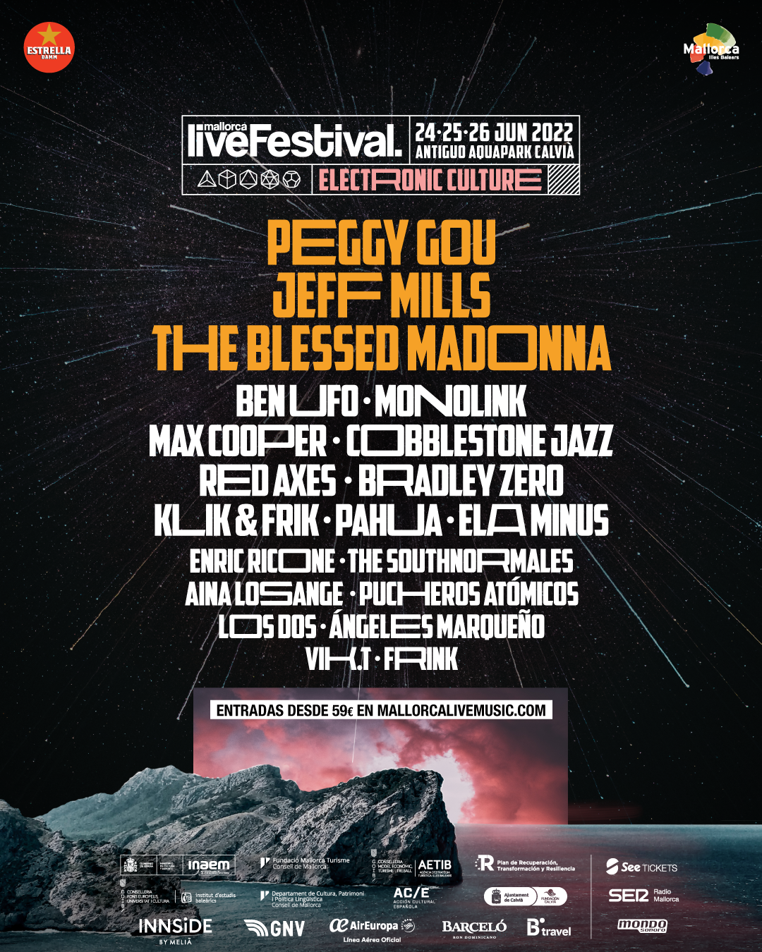 Un festival dentro de un festival. Así define la organización de Mallorca Live el cartel con su programación electrónica que ha presentado hoy. El festival, que se celebrará del 24 al 26 de junio de 2022 en el Antiguo Aquapark de Calvià, contará con una veintena de DJs que actuarán en un nuevo espacio dedicado a la electrónica dentro del recinto.