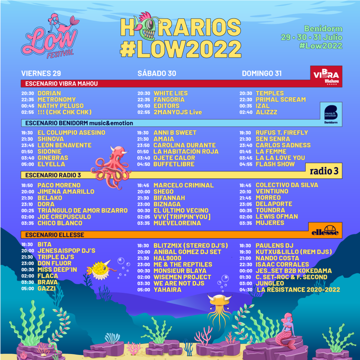 Hoy, la organización del festival presenta los horarios de sus cuatro escenarios: Vibra Mahou, Benidorm Music & Emotion, Radio 3 y Ellesse. El viernes 29 el recinto acogerá los directos de bandas internacionales de la talla de Metronomy, Nathy Peluso o !!! (Chk Chk Chk) así como bandas nacionales de primer nivel como Dorian, Sidonie, León Benavente o Ginebras. Tampoco faltarán Belako, Jimena Amarillo, Dora o Triángulo de Amor Bizarro sobre el Escenario Radio 3 o los bailes con los sets de Miss Deep’in, Flaca o Brava, entre otros, en el Escenario Ellesse.
