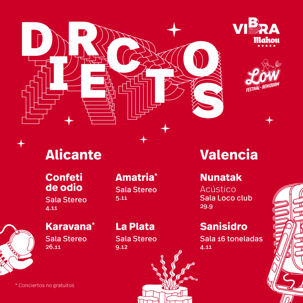 Low Festival y Vibra Mahou, la plataforma de música de Mahou Cinco Estrellas que impulsa encuentros de calidad en torno a la música en vivo, siguen generando nuevas experiencias musicales. Con esta colaboración refuerzan el apoyo a las salas y apuestan por los directos más potentes del panorama nacional en el ciclo de Directos Vibra Mahou x Low en Valencia y Alicante.