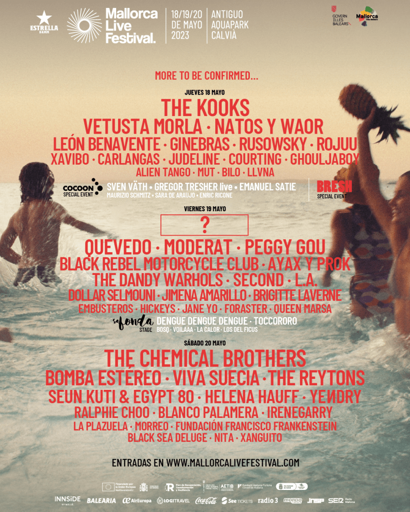 The Kooks, Quevedo y Ginebras se han sumado esta semana al cartel del evento musical más importante de las Islas Baleares, Mallorca Live Festival, a la espera de más artistas por confirmar. La sexta edición de la cita mallorquina tendrá lugar los días 18, 19 y 20 de mayo de 2023 en el Antiguo Aquapark de Calvià.