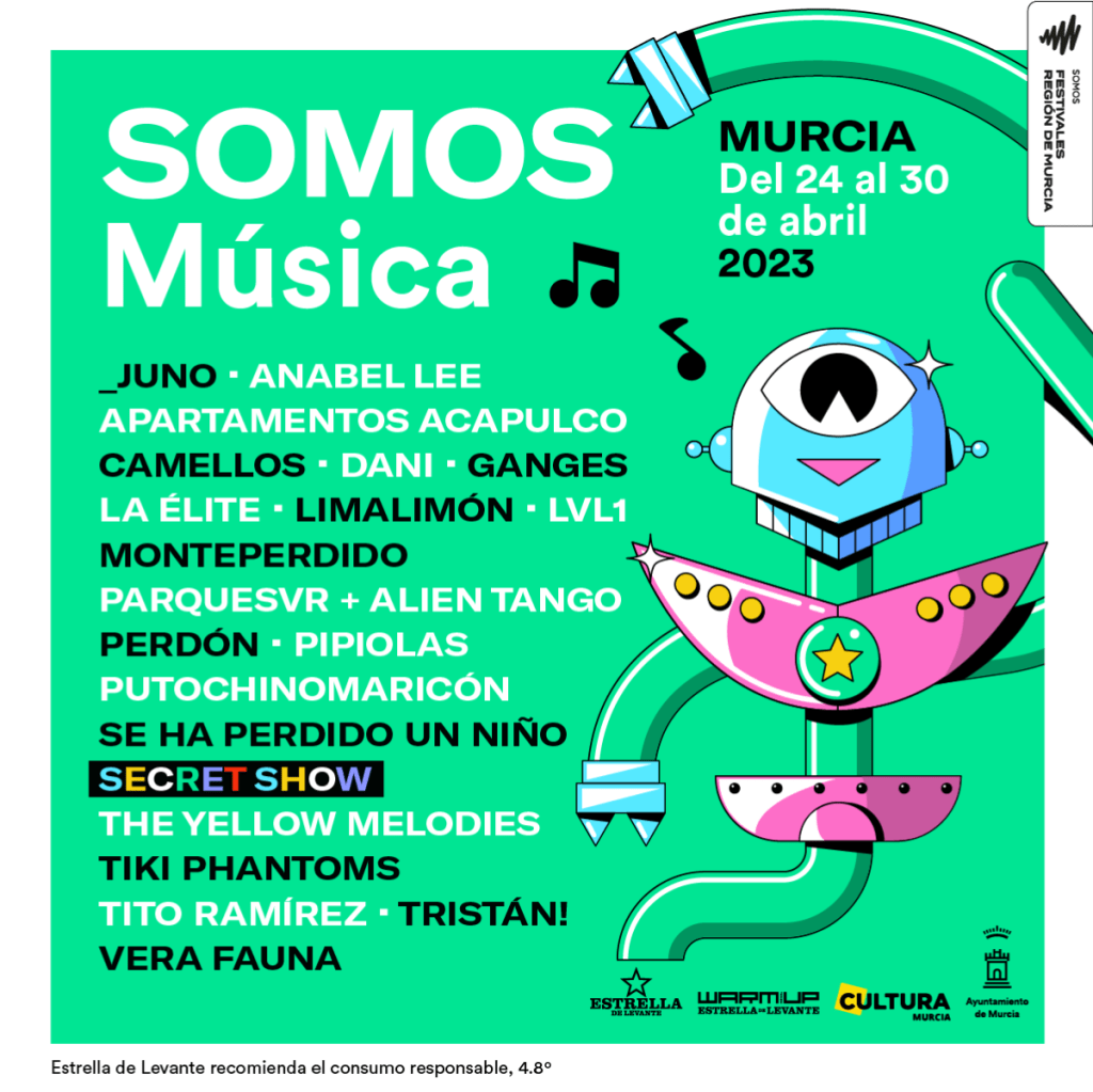 Entre los artistas de esta nueva edición de Somos Murciadestacan: Apartamentos Acapulco, que comienzan una nueva etapa donde reflejan su particular sonido shoegaze y dream pop para adentrarse en territorio más rock y noise; Camellos, que presentaron la pasada primavera su tercer y nuevo álbum, «Manual de estilo», con el que vuelven a confirmarse como una de las bandas con más personalidad de nuestra escena; Alien Tango, artista murciano considerado como uno de los creadores más peculiares tanto de la escena española como londinense; y Tiki Phantoms, quienes a lo largo de su trayectoria se han ido consolidando como uno de los mejores grupos de su estilo.