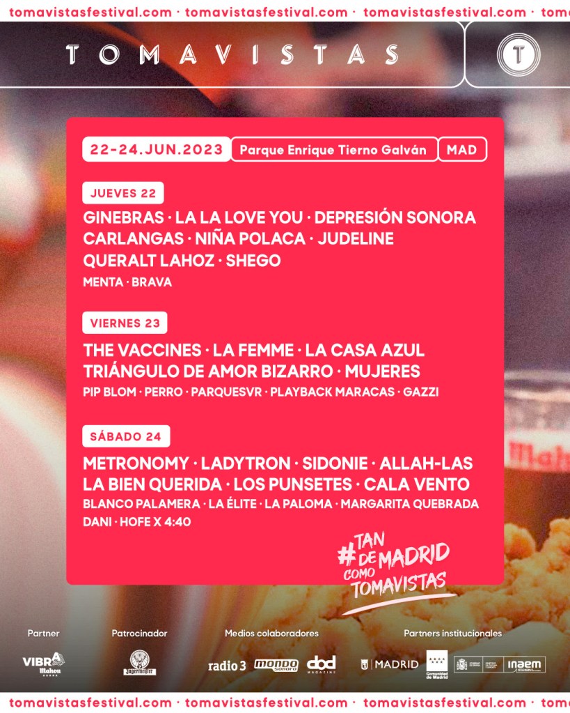 Y el sábado 24 pondrán el broche de oro a Tomavistas 2023 Metronomy, Ladytron, Sidonie, Allah-Las, La Bien Querida, Los Punsetes, Cala Vento, Blanco Palamera, La Élite, La Paloma, Margarita Quebrada, dani y HOFE X 4:40.