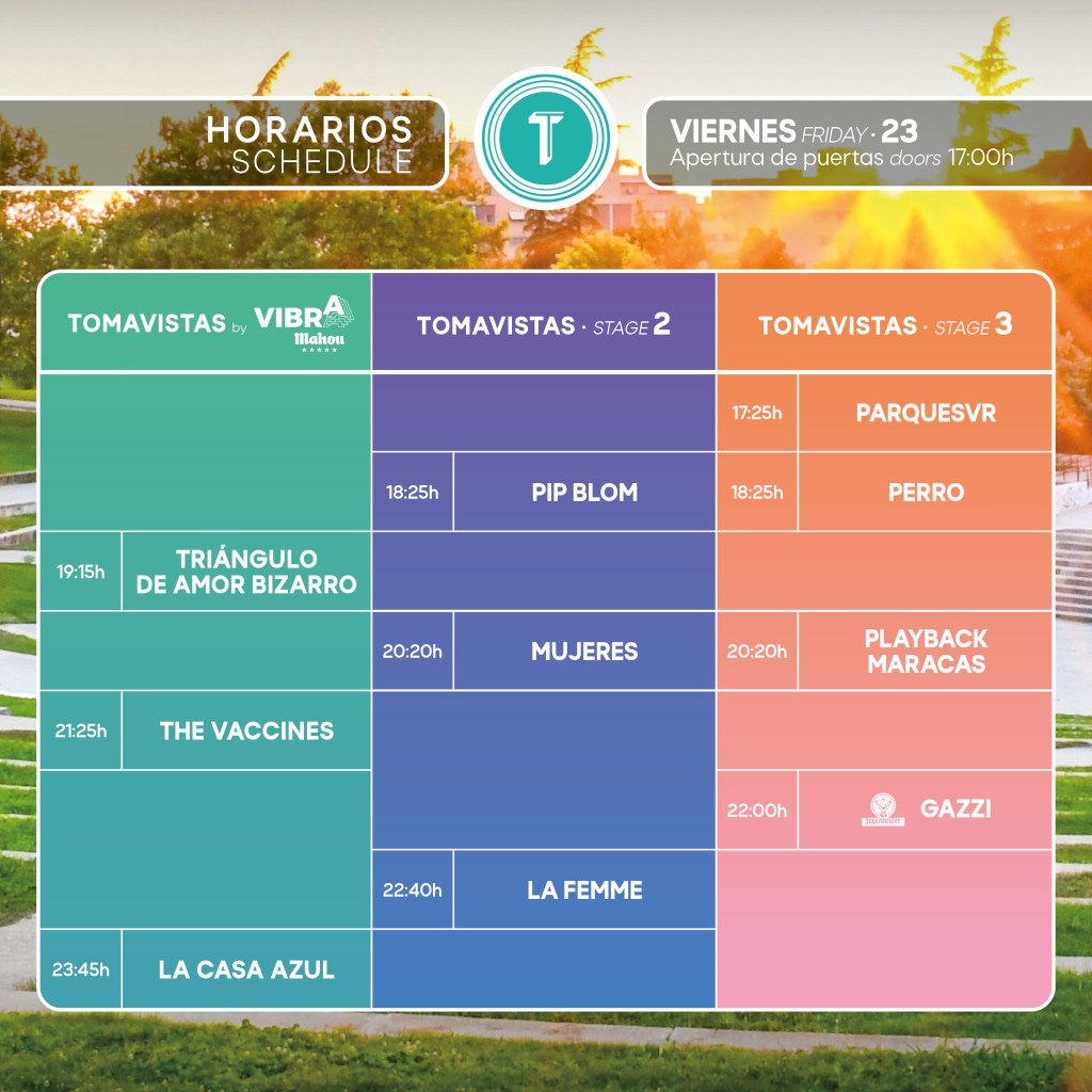 La segunda jornada comenzará con el directo macarra de Parquesvr en el escenario 3, para luego dar paso al retorno a las tablas de Perro y la electrónica de Playback Maracas y Gazzi. Los protagonistas del escenario 2 del viernes serán los británicos Pip Blom, Mujeres y el «Teatro Lúcido» de La Femme. En el escenario Tomavistas by Vibra Mahou disfrutaremos del punk inmersivo de Triángulo de Amor Bizarro, el brit-pop coreable de The Vaccines y los infinitos hits de La Casa Azul, que pondrán el broche de oro a una velada perfecta.