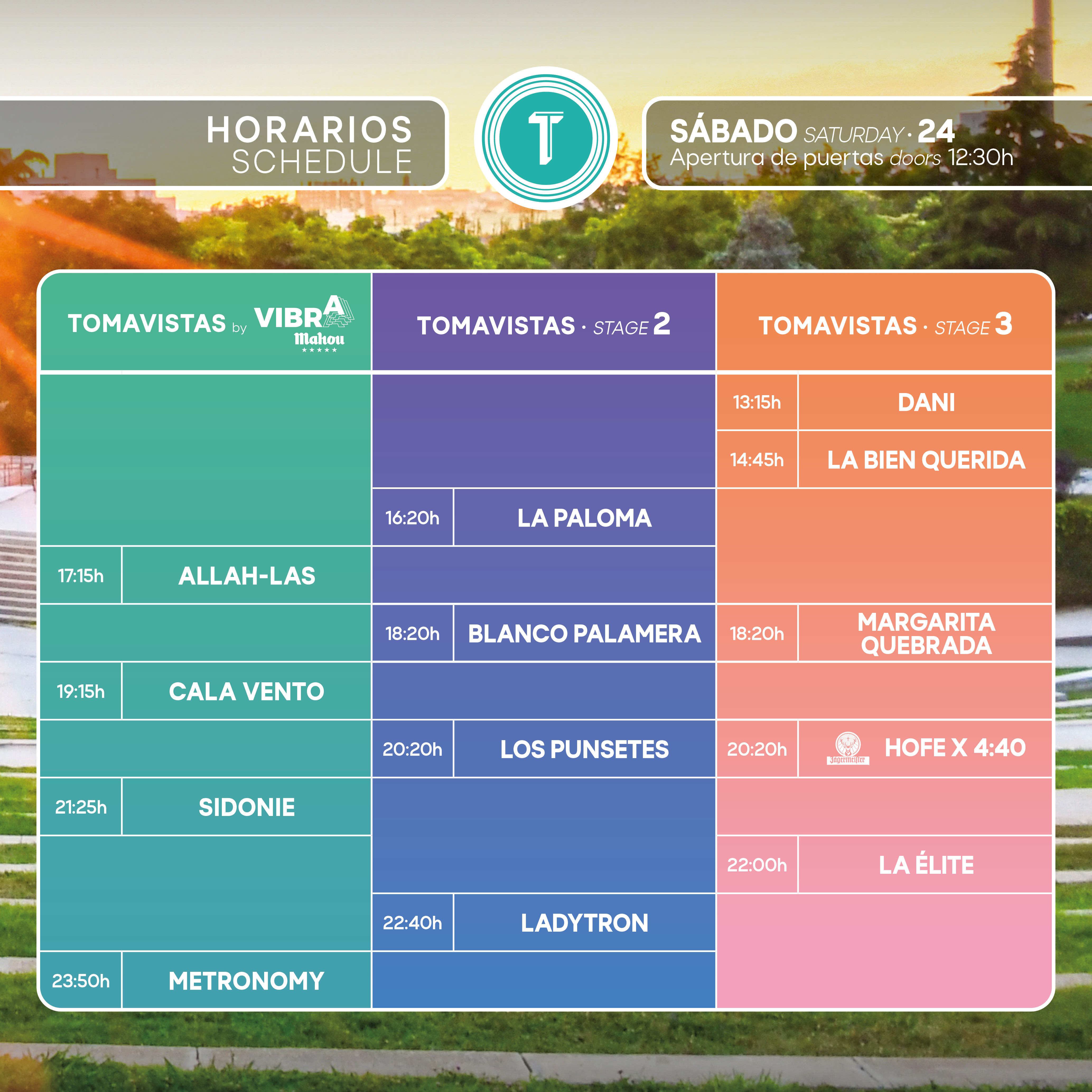 La gallega Dani dará el pistoletazo de salida al sábado, acompañada después en el escenario 3 por La Bien Querida, Margarita Quebrada, Hofe x 4:40 y La Élite. El rock de La Paloma, Blanco Palamera y Los Punsetes tomará el escenario 2, para terminar la noche con la fiesta de Ladytron. La psicodelia de Allah-Las, el rock de Cala Vento y Sidonie llenarán el escenario principal de buen rollo, para despedir el festival por todo lo alto con los himnos de los ya míticos Metronomy.