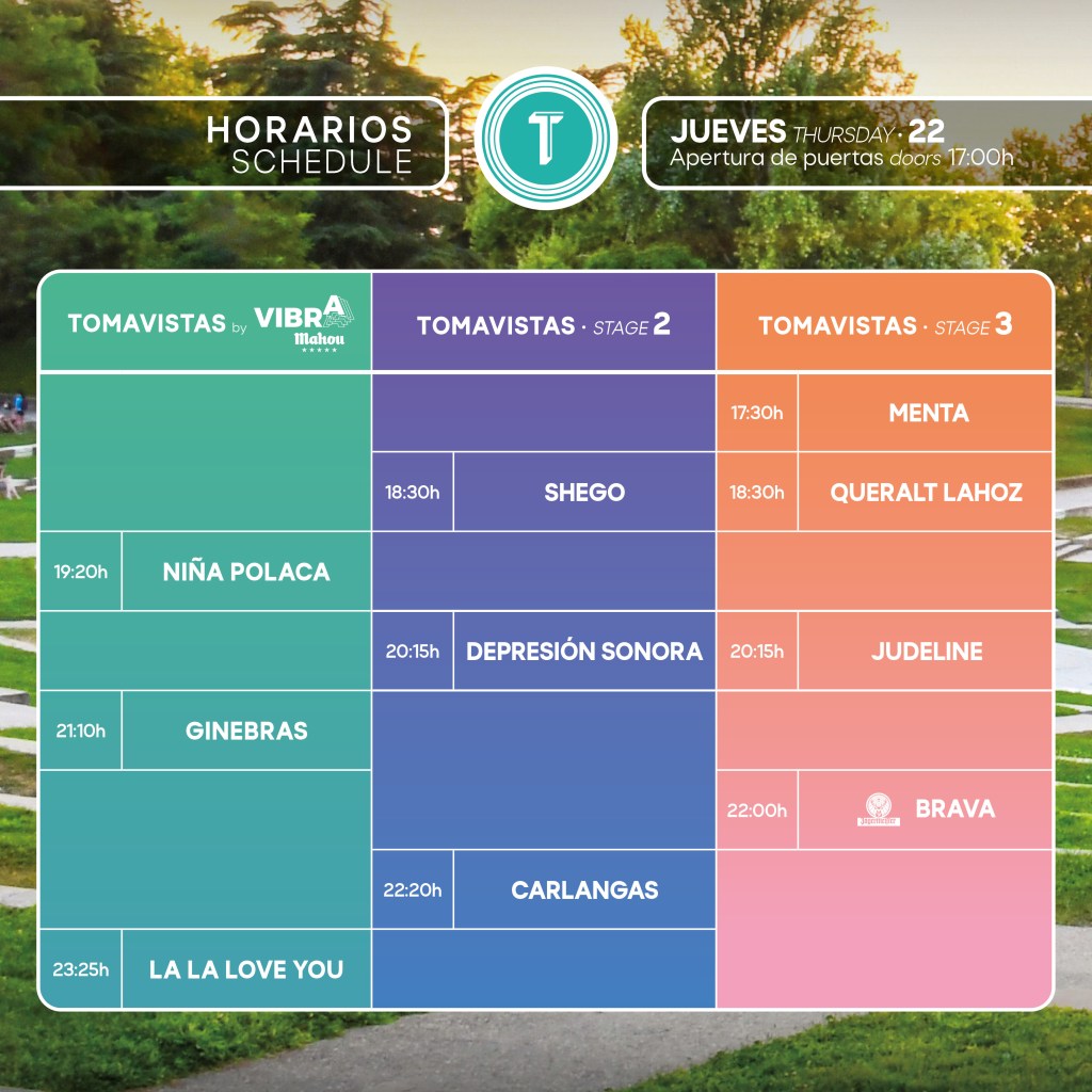 La inauguración del festival vendrá a cargo de Menta el jueves en el escenario 3, para luego dar paso a las actuaciones de Queralt Lahoz, Judeline y Brava, en ese mismo escenario; Shego, Depresión Sonora y Carlangas en el segundo stage; y Niña Polaca, Ginebras y La La Love You, para finalizar la jornada, en el escenario principal.