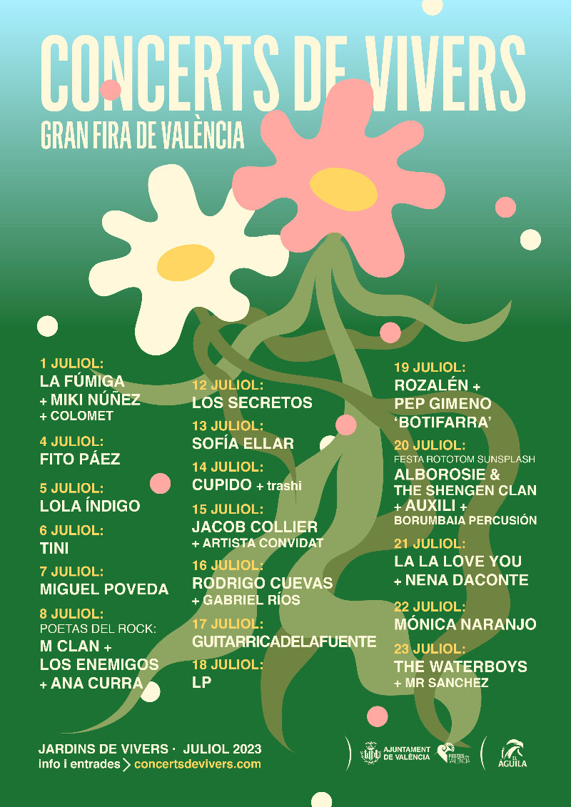 Los artistas encargados de abrir el escenario de los Jardines de Viveros de Valencia el próximo sábado 1 de julio, La Fúmiga, Miki Núñez y Colomet, ofrecerán una noche de sonidos festivos y bailables. Unos días después, el martes 4, el argentino Fito Páez llegará a Valencia en el marco de la gira de celebración del 30º aniversario del disco El amor después del amor. El miércoles 5 será el turno de la polifacética Lola Índigo, quien presentará el disco El dragón. Precisamente, Tini, artista que ha colaborado con Lola Índigo, cogerá el testigo de la madrileña el jueves 6 para demostrar por qué es una de las grandes figuras de los ritmos latinos actuales. Por otro lado, Miguel Poveda actuará el viernes 7 con el espectáculo Diverso, donde transita por el flamenco, el tango o la canción popular mexicana. El fin de semana se cerrará el sábado 8 de julio con la velada Poetas del Rock con la presencia de las bandas M Clan, Los Enemigos y Ana Curra.