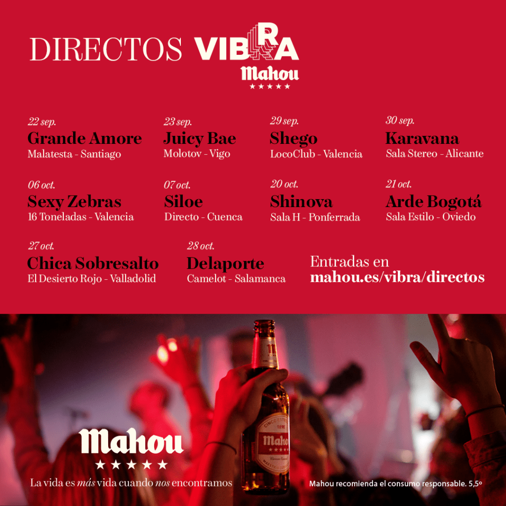Tras la vorágine de festivales, conciertos y shows al aire libre que se vivirá en estos meses estivales, Vibra Mahou se ha propuesto que la música siga sonando en las salas, esos espacios de encuentro claves para el desarrollo del talento emergente y la música en directo. Gran muestra de ello esel nuevo ciclo que tendrá lugar durante septiembre y octubre: Directos Vibra Mahou 2023. La plataforma de música de Mahou Cinco Estrellas presenta un total de diez conciertos que, entre el 22 de septiembre y el 28 de octubre, recorrerán las salas de referencia de nueve ciudades españolas. En la Comunidad Valenciana, el ciclo pasará por Valencia y Alicante y acogerá los directos de Shego, Karavana y Sexy Zebras los días 29, 30 de septiembre y 6 de octubre respectivamente.