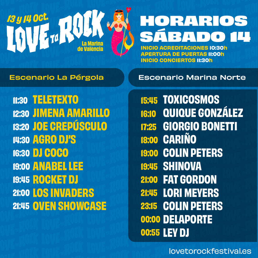 El sábado 14 de octubre, abrirá la jornada por la mañana en Escenario La Pérgola la actuación de Teletexto a las 11.30h, Jimena Amarillo a las 12.30h, Joe Crepúsculo a las 13.20h, Agro DJ’s a las 14.30h. Y la sesión de tarde en este mismo escenario, será desde las 19.00h con Anabel Lee, 19.45h Rocket DJ, 21.00h Los Invaders y 21.45h Oven Showcase. Y en Escenario Marina Norte, a las 15.45h la sesión de Toxicosmos, 16.10h Quique González, 17.25h Giorgio Bonetti, 18.00h Cariño, 19.00h Colin Peters, 19.45h Shinova, 21.00h Fat Gordon, 21.45h Lori Meyers, 23.15h Colin Peters, 00.00h Delaporte y la despedida de esta edición será a cargo de Ley DJ a las 00.55h.