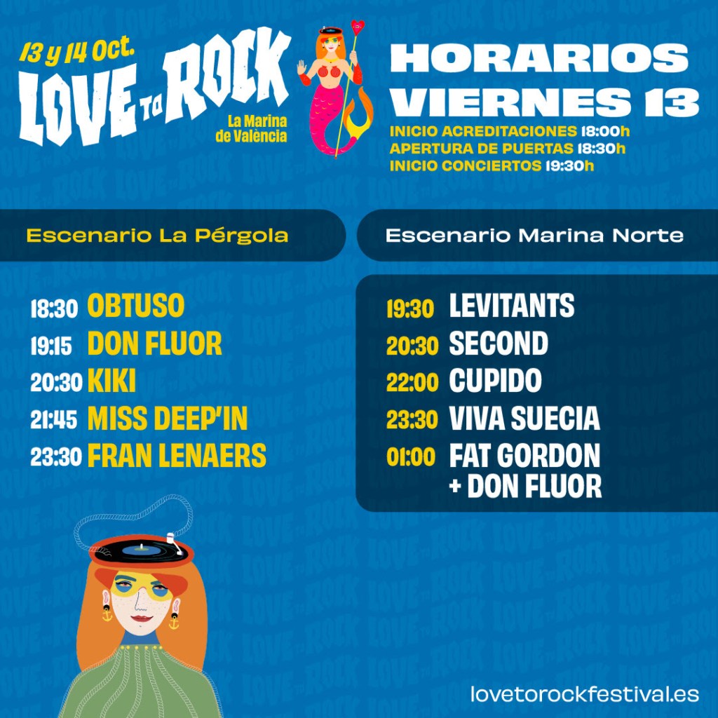 El viernes 13 de octubre, la programación comenzará a las 18.30h en el Escenario La Pérgola con las sesiones de DJ de Obtuso, 19.15h Don Fluor, 20.30h Kiki, 21.45h Miss Deep’in y 23.30h Fran Lenaers. En paralelo, el Escenario Marina Norte, a las 19.30h actuarán Levitants, 20.30h Second,22.00h Cupido, 23.30h Viva Suecia y 00.00h el cierre con Fat Gordon y Don Fluor.