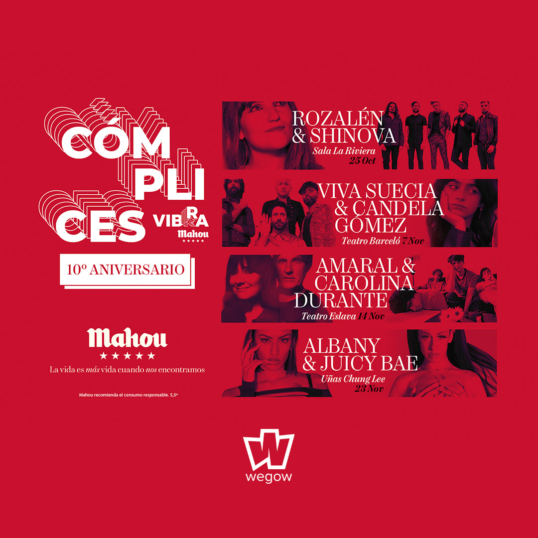 La presencia de Amaral en macro-eventos nacionales ha llevado a Eva, Juan y compañía a ser parte de esta nueva edición de ‘Cómplices’ de Vibra Mahou junto a Carolina Durante, el cuarteto que le ha dado un lavado de cara a la música de guitarras en nuestro país; ambos estarán el 14 de noviembre en el Teatro Eslava. Por último, al cóctel musical previo se unen dos jóvenes figuras de la música urbana española: Albany y Juicy Bae, clausurando el ciclo el 23 de noviembre en Uñas Chung Lee.