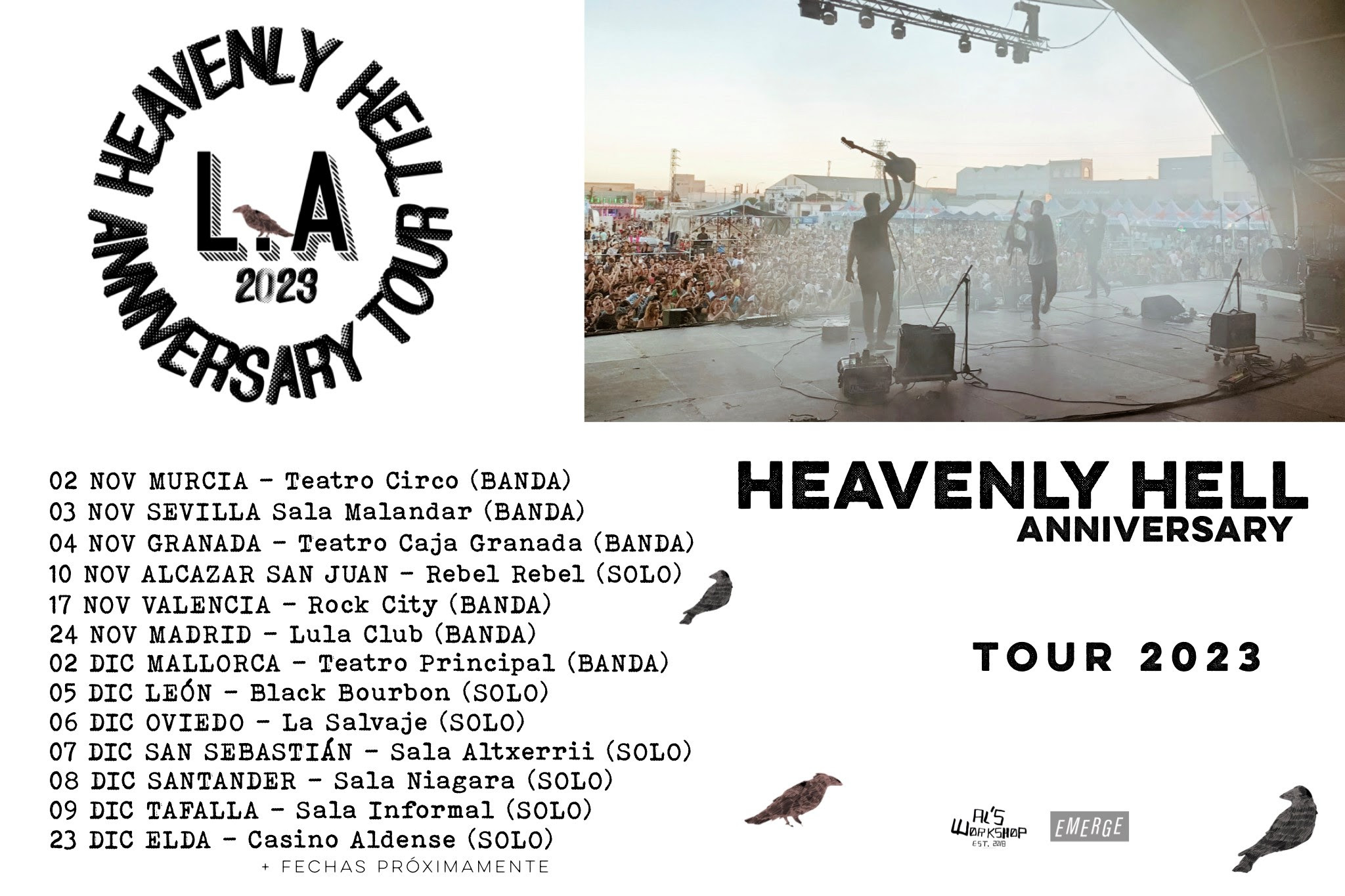 L.A. continúa con la gira celebración de la reedición -por primera vez en vinilo- de su aclamado primer disco Heavenly Hell. El grupo mallorquín actuará los próximos días de noviembre en Murcia jueves 2 en el Teatro Circo, viernes 3 en la Sala Malandar de Sevilla y el sábado 4 en el Teatro Caja Granada interpretando el disco de manera íntegra además de sus canciones más conocidas y queridas por sus múltiples fans y que promete, 14 años después, dejar las emociones a flor de piel, celebrando el pasado pero centrados siempre en el presente.