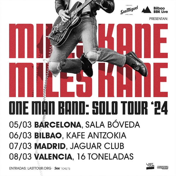Gracias a la colaboración entre San Miguel y Bilbao BBK Live, llevando más allá la alianza surgida a raíz del festival bilbaíno, Miles Kane pasará por cuatro ciudades de nuestro país en 2024. La primera fecha será el 5 de marzo en la Sala Bóveda de Barcelona, la segunda el 6 de marzo en el Kafe Antzokia de Bilbao, la tercera el 7 de marzo en Jaguar Club de Madrid y la última el 8 de marzo en 16 Toneladas de Valencia. Las entradas saldrán a la venta este viernes 27 a las 10h y se podrán adquirir a través de la agenda de Last Tour y seetickets.com/es.