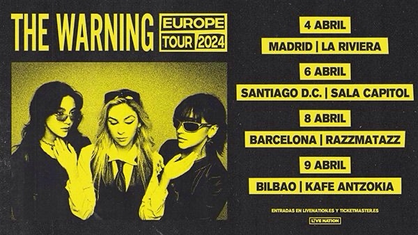 Preparadas para dominar el mundo en 2024, las tres hermanas mexicanas que forman la banda de hard rock The Warning se embarcarán en una intensa gira europea que incluye cuatro fechas en España: el 4 de abril en La Riviera de Madrid, el 6 de abril en la sala Capital de Santiago de Compostela, el 8 de abril en la sala Razzmatazz de Barcelona y el 9 de abril en el Kafe Antzokia de Bilbao.