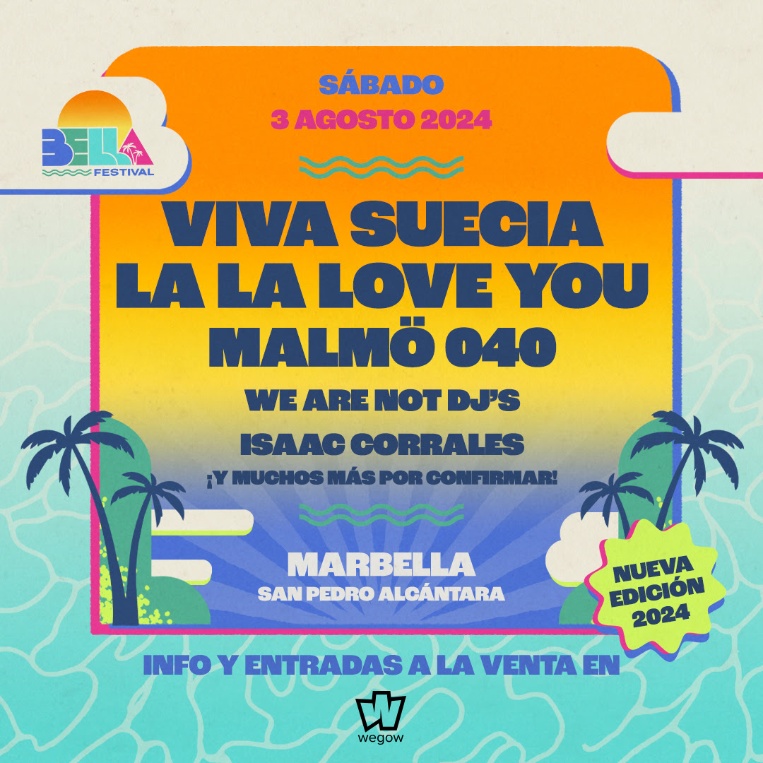 Despues de una exitosa edición que contó con más de 10.000 asistentes, Bella Festival regresa por segunda vez para dar por inaugurada la época estival. Tras acoger sobre sus tablas a artistas como Guitarricadelafuente, Leiva, Dorian o Arde Bogotá, en 2024 pone sobre la mesa un cartel sobresaliente que contará con la presencia de Viva Suecia, La La Love You y Malmö 040 como primeros nombres confirmados.