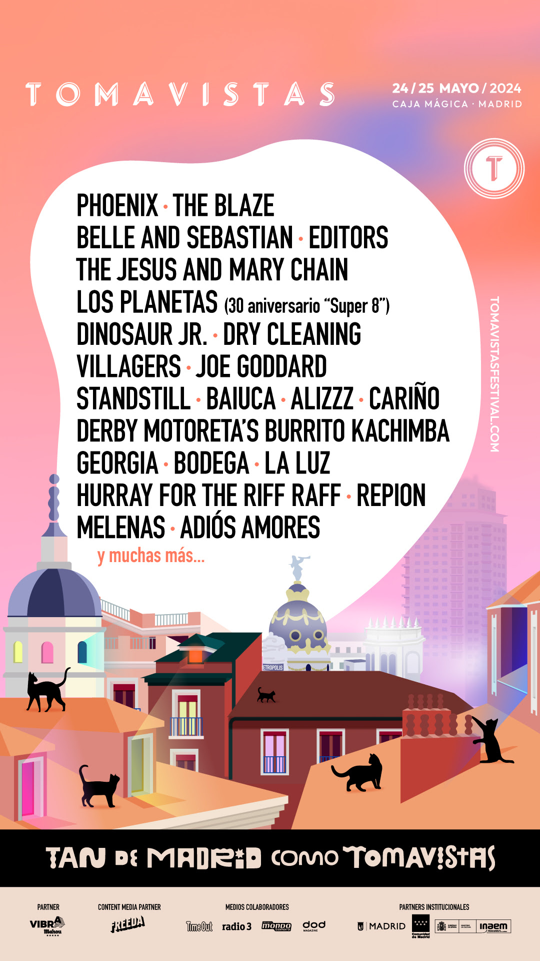 Nuevos nombres para Tomavistas 2024. Phoenix, Editors, Villagers, Joe Goddard, Cariño, Georgia, Repion, Melenas y Adiós Amores se suman al festival madrileño, que celebrará su octava edición y diez años de vida los días 24 y 25 de mayo en la Caja Mágica.